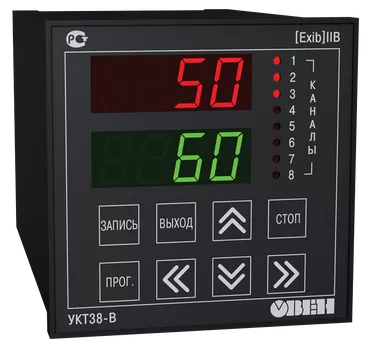 Устройство контроля температуры восьмиканальное с аварийной сигнализацией и встроенным барьером искрозащиты ОВЕН УКТ38-В предназначено для контроля температуры в нескольких зонах одновременно (до 8-ми) и аварийной сигнализации о выходе любого из контролируемых параметров за заданные пределы, а также для их регистрации на ПК.