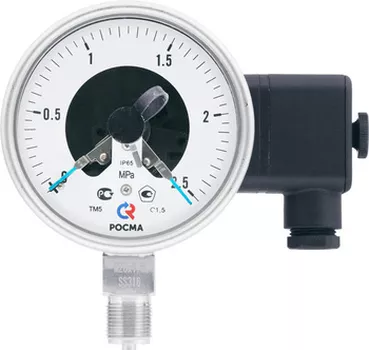 Промышленный манометр, устойчивый к воздействию агрессивных измеряемых сред, с возможностью гидрозаполнения (виброустойчивый). Оснащен электроконтактной приставкой для управления внешними электрическими цепями.