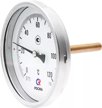 Термометр осевой биметаллический предназначен для измерения температуры жидкостей, пара и газов в отопительных и санитарных установках, в системах кондиционирования и вентиляции. Принцип действия термометров БТ основан на зависимости деформации чувствительного элемента от измеряемой температуры. В качестве чувствительного элемента используется биметаллическая пружина. Биметаллическая пружина изготавливается из двух прочно соединенных металлических пластин, имеющих различные температурные коэффициенты линейного расширения. При изменении температуры пружина изгибается и вращает стрелку термометра. Один конец пружины закреплен внутри штока, а к другому присоединяется ось стрелки.