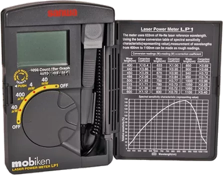 Измеритель мощности лазерного излучения Sanwa LP1 предназначен для облегчения оценки уровня мощности лазерного излучения при проверке и обслуживания оборудования, использующего это излучение. Калиброван для излучения гелий-неонового лазера 633 нм и позволяет непосредственно считывать показание мощности оптического излучения в визуальном пятне, например, оптической системе проигрывателей DVD и т. п.