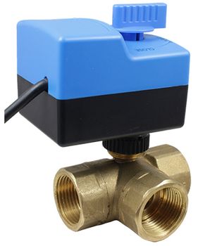 Кран шаровой трехходовой неполнопроходной с электроприводом и резервным ручным управлением для управления потоком рабочей среды в трубопроводе