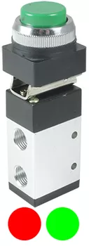 В исходном положении порт питания P перекрыт, рабочий порт А соединен с портом выхлопа R. При нажатии на кнопку порт питания Р соединяется с рабочим портом А, а порт выхлопа R перекрывается. При снятии питания золотник под действием пружины возвращается в исходное положение.