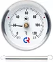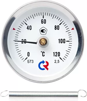 Термометр биметаллический накладной (термометр с пружиной) предназначен для измерения температуры поверхности трубы. Принцип действия термометров БТ основан на зависимости деформации чувствительного элемента от измеряемой температуры. В качестве чувствительного элемента используется биметаллическая пружина. Биметаллическая пружина изготавливается из двух прочно соединенных металлических пластин, имеющих различные температурные коэффициенты линейного расширения. При изменении температуры пружина изгибается и вращает стрелку термометра (биметаллическая пружина навита вокруг оси контактного элемента, а стрелка закреплена непосредственно на биметалле).