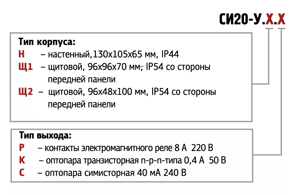 Цифровой счетчик импульсов СИ20 выпускается в корпусах 3-х типов: настенном Н и щитовых Щ1, Щ2.